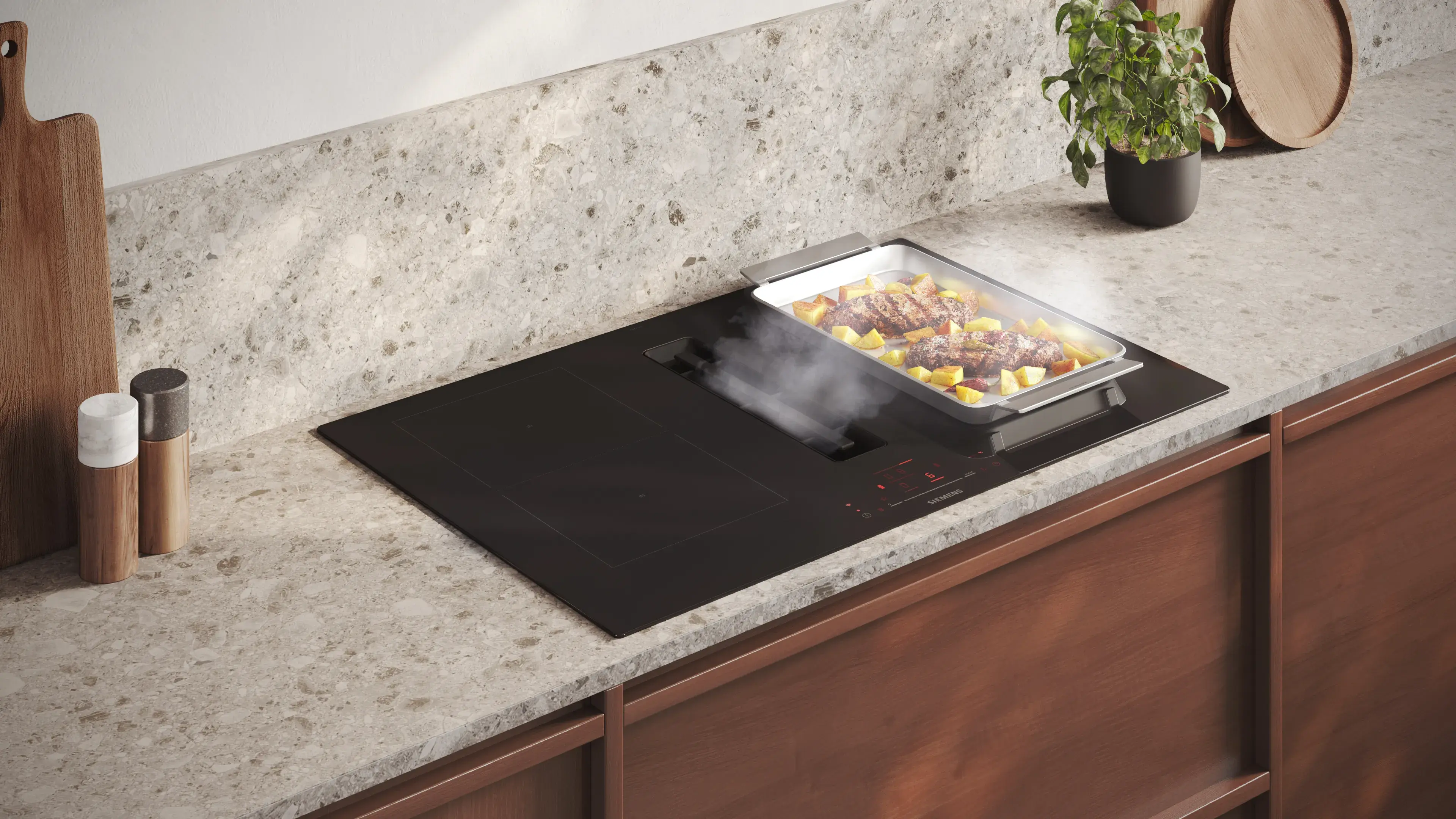 Ob wandmontiert, über einer Kücheninsel hängend, in ein Kochfeld integriert oder in der Arbeitsplatte versenkt – die hochmodernen Lüftungssysteme und Dunstabzugshauben von Siemens sorgen für eine geräuscharme und dampffreie Umgebung, in der Sie Ihre kulinarischen Ambitionen verwirklichen können. Entdecken Sie charakteristisches Design und starke Leistung für jede Küchenanordnung in der Siemens Produktpalette für Lüftungslösungen.